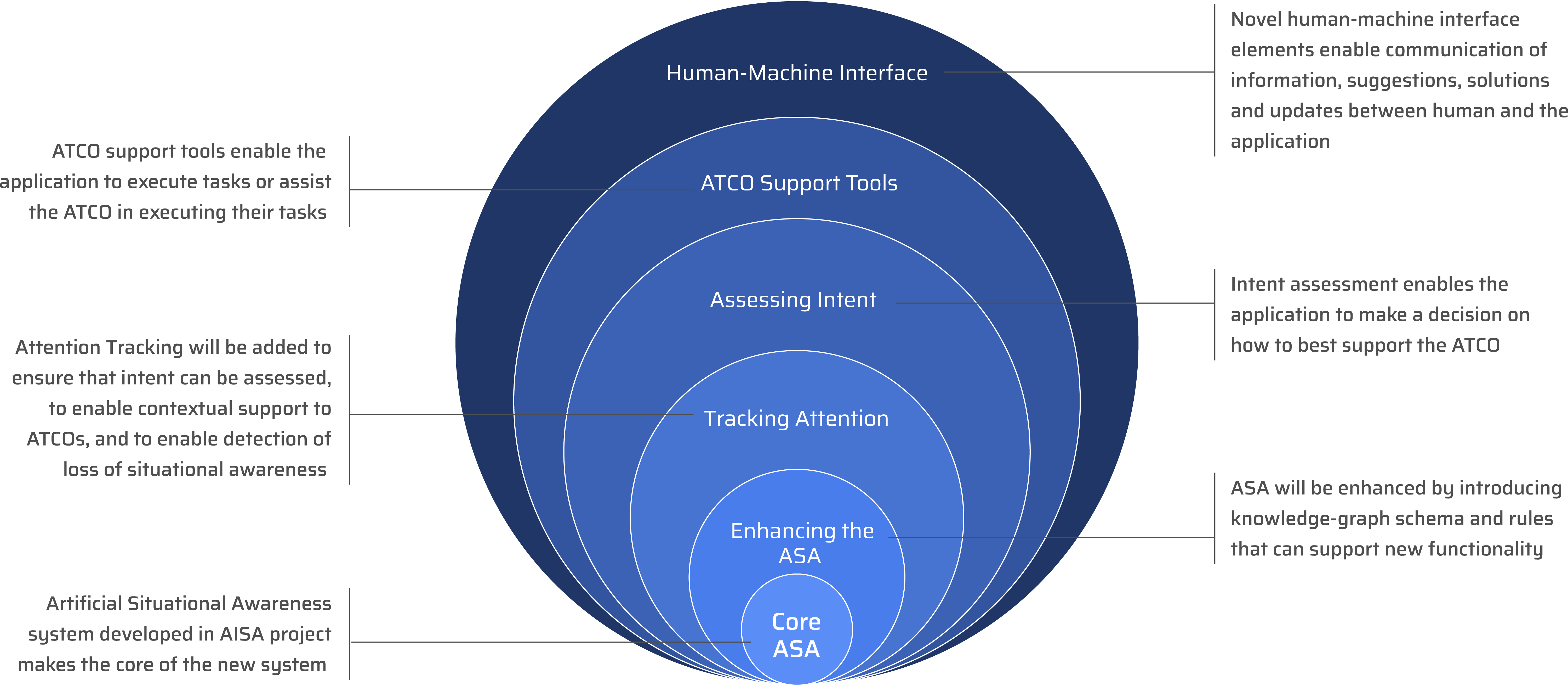 At its core, the Artificial Situational Awareness system developed by AWARE gathers high-integrity information through aeronautical information exchange models. This information is used to construct a comprehensive knowledge graph that accurately depicts the traffic situation at either a sector or ACC level. The system goes beyond merely compiling factual knowledge; it also incorporates a knowledge-based system that manages and executes rule-based knowledge. This is achieved through a reasoning engine that operates on top of the factual data.